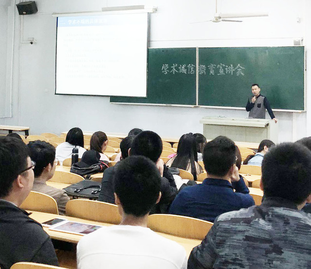 于2018年5月7日下午,在科学讲堂8100教室开展了以“坚守学术诚信,捍卫科学尊严,做文明崇德大学生”为题的学术诚信教育大会。本次教育大会由饶家辉副书记主讲,2013级全体毕业生参加。