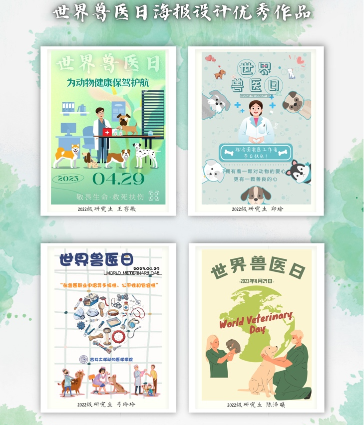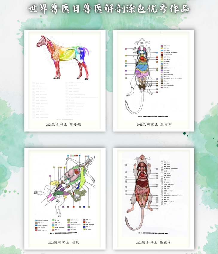2023年4月3日至21日,举办了“弘扬职业精神,献礼世界兽医”主题作品征集活动。活动内容包括兽医解剖涂色、最美兽医摄影作品以及世界兽医日海报设计。本活动通过评委打分与网络投票两种方式进行评选,全院师生积极参与,累计网络票数16万9千余票,共有12份优秀作品脱颖而出。