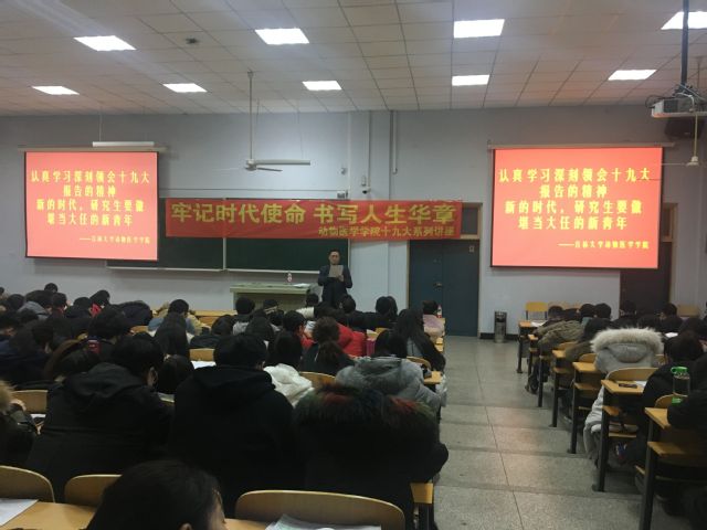 本次讲座的主题为:认真学习深刻领会十九大报告的精神,新的吋代,研究生要做堪当大任的新青年。栾书记认真仔细的向同学们介绍了十九大报告结构13个部分和报告提出的100件事等。告诉同学们新的时代,研究生要做堪当大任的新青年。要牢固树立新思想,时刻牢记新使命,刻苦锤炼新本领,奋发展现新作为,用新思想武装自己,用实干的行动证明自己,明大势、识大局、知大任,为新时代中国特色社会主义伟大胜利而奋斗。