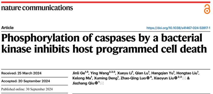 邱家章教授团队在学术期刊《Nature Communications》上发表,题为“Phosphorylation of caspases by a bacterial kinase inhibits host programmed cell death”的研究论文。