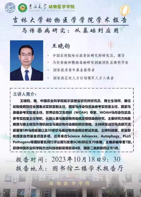 报告题目 马传染病研究:从基础到应用 报告时间 2023年10月18日