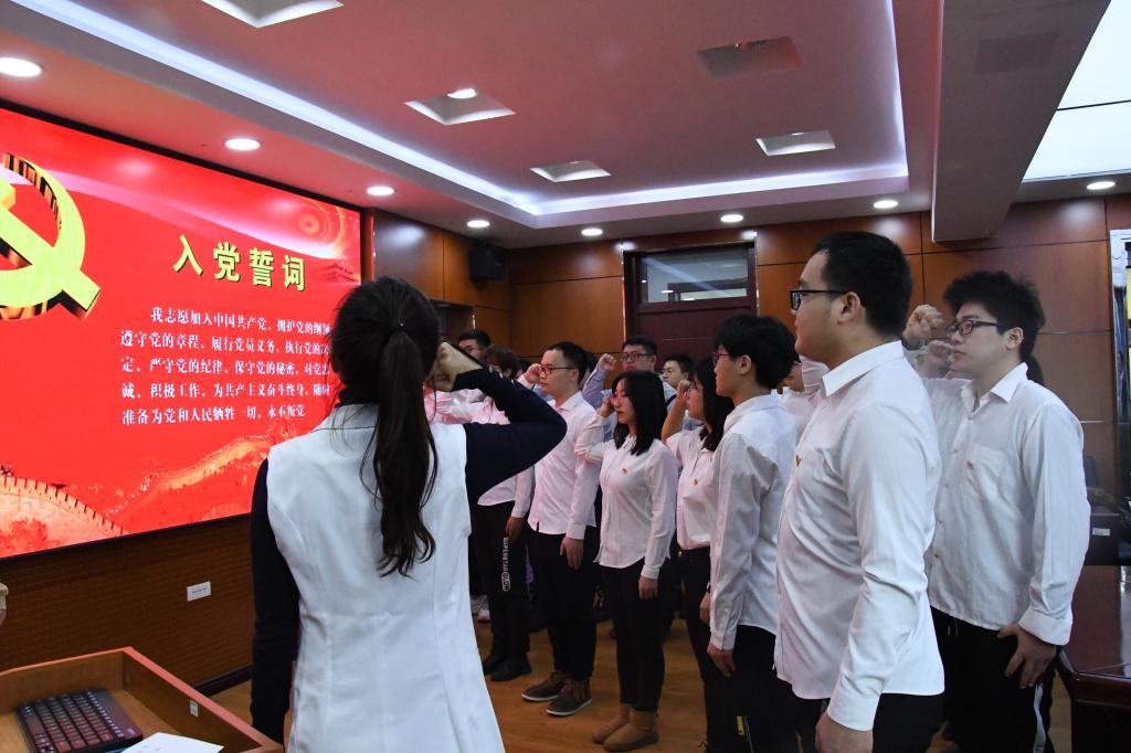 鲜红的党旗,醒目的主题横幅,简而有力地为现场渲染出庄重的气氛,在雄壮的《国际歌》后,宣誓仪式开始,由周靓主任宣读新党员名单。随后,在党员周靓主任的带领下,19名新党员怀着无比激动的心情举起右手握拳,面对鲜红的党旗齐声宣读入党誓词,每个同学都用发自内心的声音抒发对党忠诚的决心。面对着党旗,大家接受了一次身心的特殊洗礼。之后来自临床党支部的新党员代表刘久茜同志做了代表演讲。她的演说词道出了所有预备党员的心声,表达了自己要恪守在党旗下的诺言,更加严格要求自己,时刻保持共产党员的先进性和先锋模范作用,努力使自己成为一名优秀共产党员的决心和信心。随后栾书记就习近平新时代中国特色社会主义思想下党员应肩负的责任与使命和不忘初心牢记使命的具体含义以老党员的身份深入浅出地同新党员进行了分享。
