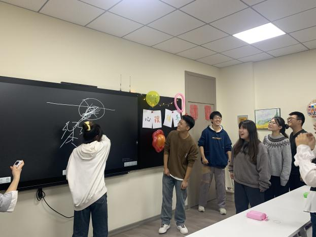 接下来的游戏是你画我猜2.0,每组选出一名同学进行猜题,剩下的同学则在黑板上画出题目。其中不乏许多“灵魂画手”,画出的题目有些难以辨认,逗得全体同学笑声连连。当然也不乏十分有想象力的同学,即使是抽象的画作也可以成功猜出谜底。
