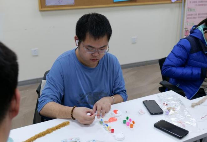 本次活动为同学们准备了五颜六色的编织材料包和形态各异的石膏娃娃及彩绘颜料。首先由主持人向同学们介绍了本次活动的主题与流程,鼓励同学们自由组队。随后在工作人员的引导下,同学们纷纷开始创作,充分发挥想象力,编织和描绘属于自己个性而富有创意的作品。创作过程中现场气氛热烈,充满欢声笑语。有人编织出了可爱的小狗狗,有人绘制出俏皮可爱的卡通形象;在一笔一画、一编一织间,同学们不仅舒缓了紧张情绪,更沉浸在创作的乐趣中。