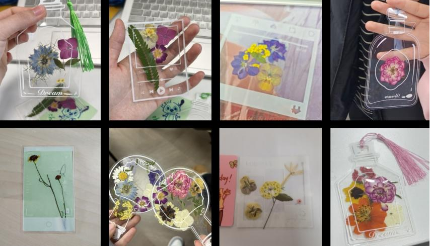 活动现场准备了干花、马克笔及书签等材料,同学们循着心意自由创作。他们用干花与马克笔勾勒巧思,让普通书签成为承载个性与创意的作品。现场氛围专注而融洽,一件件独具创新的作品在指尖成型,盛满了同学们当下创作的热情。随后,同学们互相分享作品并诉说创作时的想法及作品背后的故事。