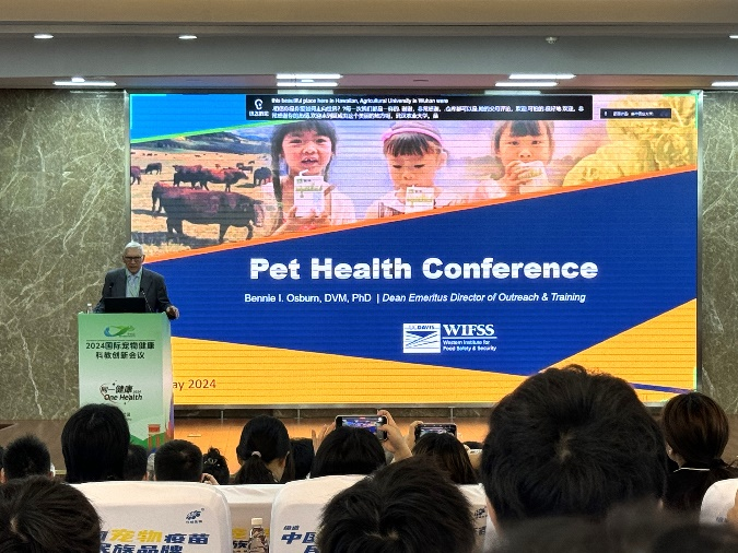 名誉院长Dr.Bennie Osburn教授分别为大会致辞,并作题为“One Health Pet Overview”的专题报告。他从疫病流行、食物链、人畜共患病生态学等方面阐释了“同一健康”的深远意义。他表示,“同一健康”体现在生物圈的方方面面,多领域、多团队、多系统的通力合作是实现“同一健康”的关键。