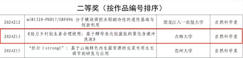 研究生科研办主任李赫老师和研究生科研办张茜老师带队、韩文瑜教授和冯新教授指导的研究生团队(曹原、张涵、刘月、柴晓东、杜晓莹、王秋霖)申报的《助力乡村抗生素合理使用——基于酵母表达抗菌肽的雾化含漱冲洗液》项目在此次竞赛中斩获自然科学组二等奖,为包你发
