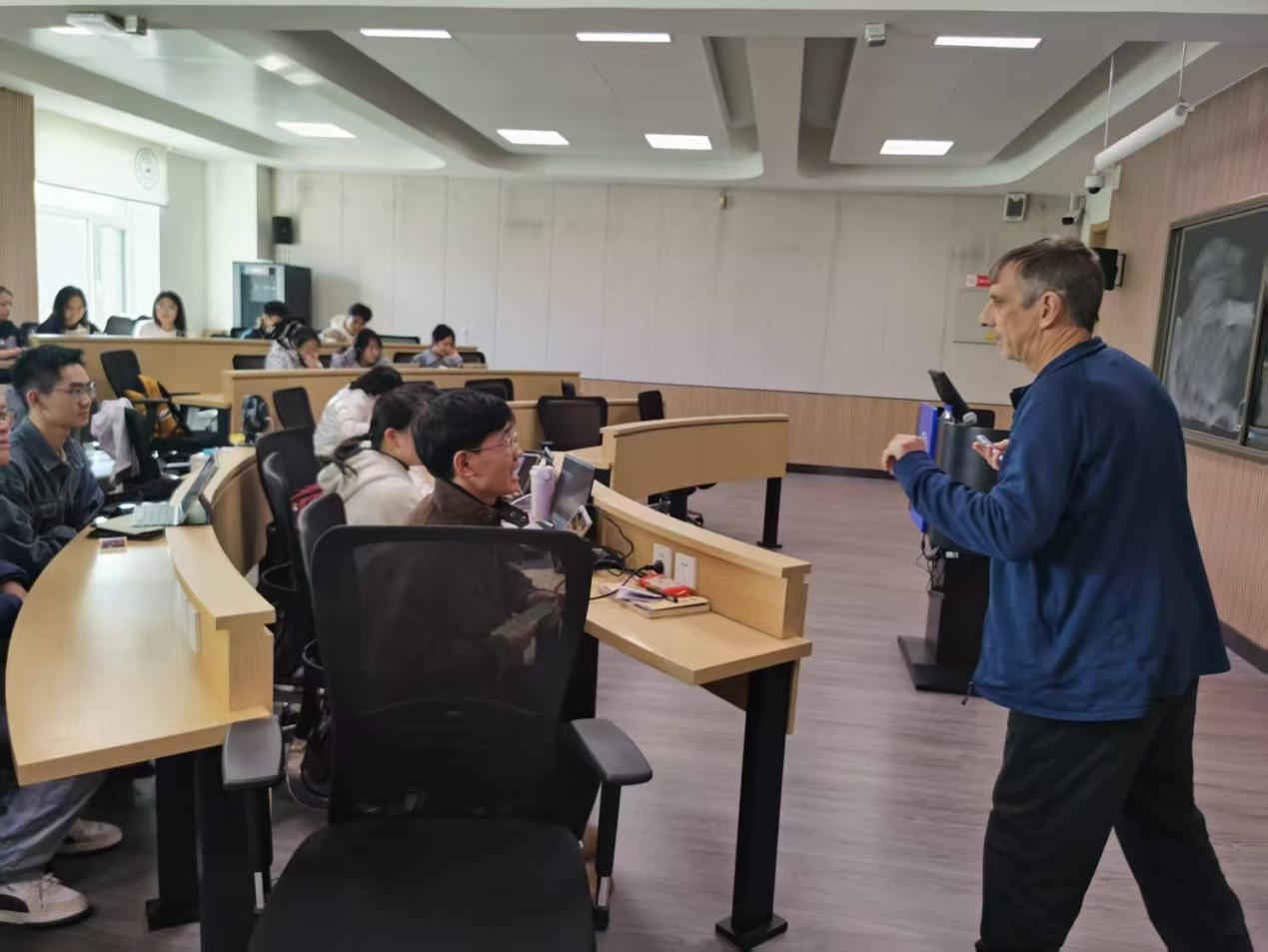 课程初期,面对全英文授课环境,部分同学存在畏难情绪,课堂互动较为沉默。Langford教授及时调整教学节奏,通过幽默的语言、生动的案例以及耐心的引导,逐步打消学生的顾虑。随着课程推进,课堂氛围愈发轻松活跃,同学们不仅能够熟练跟上授课节奏,还主动开口用英语交流观点、提出疑问,在提升专业素养的同时,也显著增强了英语学术沟通能力。